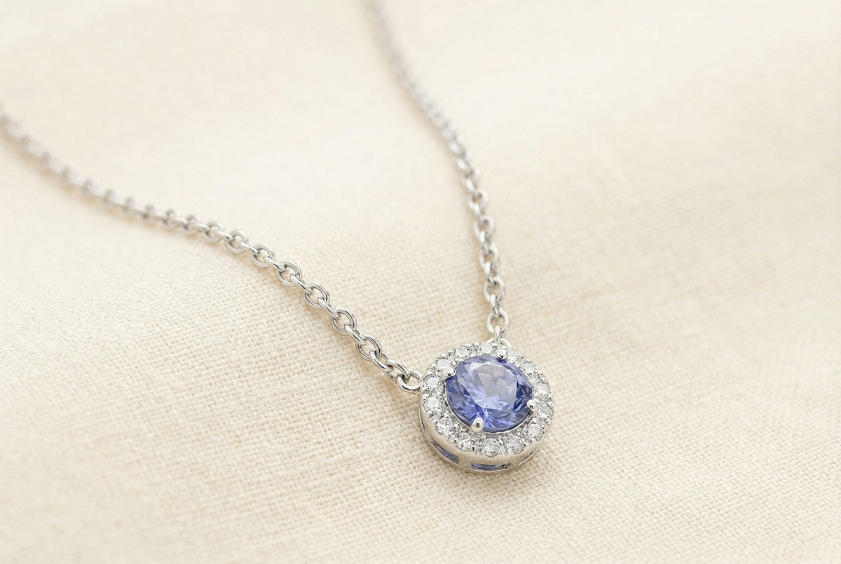 « L'ATELIER » N.º 202027Collar Oro blanco 18 quilates - Zafiro azul redondo 0.3 quilates - Halo Diamante - Cadenas Esclavas