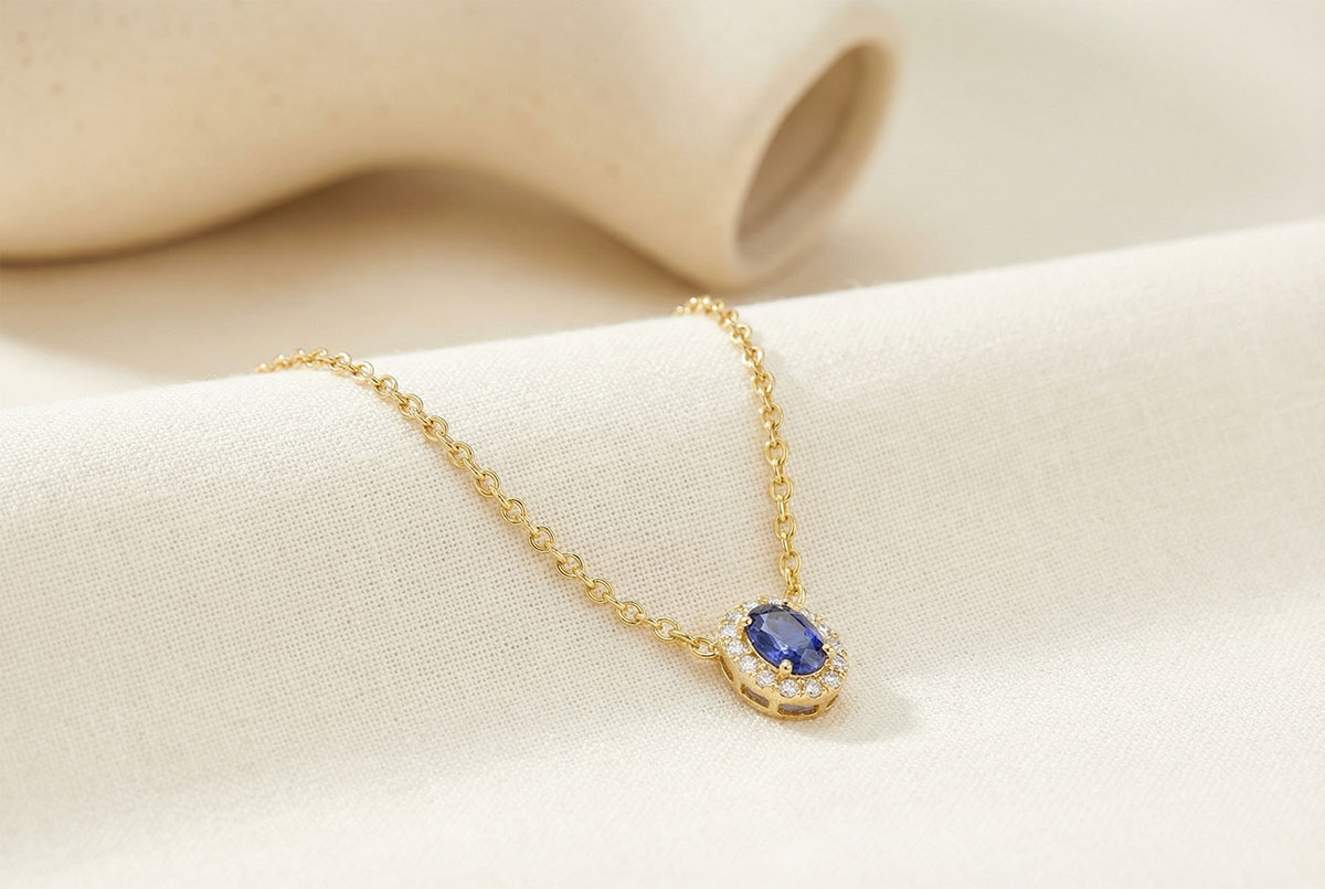 « L'ATELIER » N.º 202121Collar Oro amarillo 18 quilates - Zafiro azul Ovalo 0.3 quilates - Halo Diamante - Cadenas Esclavas