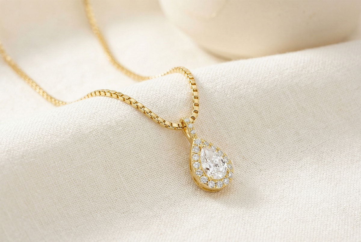 « L'ATELIER » N.º 204406Colgante Oro amarillo 9 quilates - Diamante de laboratorio Pera 0.3 quilates - Halo Diamante de laboratorio - Engastado Diamante de laboratorio - Cadenas Veneciana