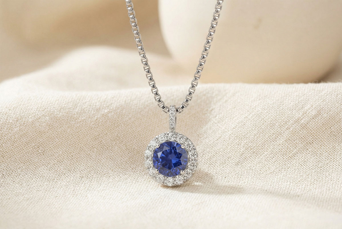 « L'ATELIER » N.º 205943Colgante Oro blanco 18 quilates - Zafiro azul redondo 0.3 quilates - Halo Diamante - Engastado Diamante - Cadenas Veneciana 4