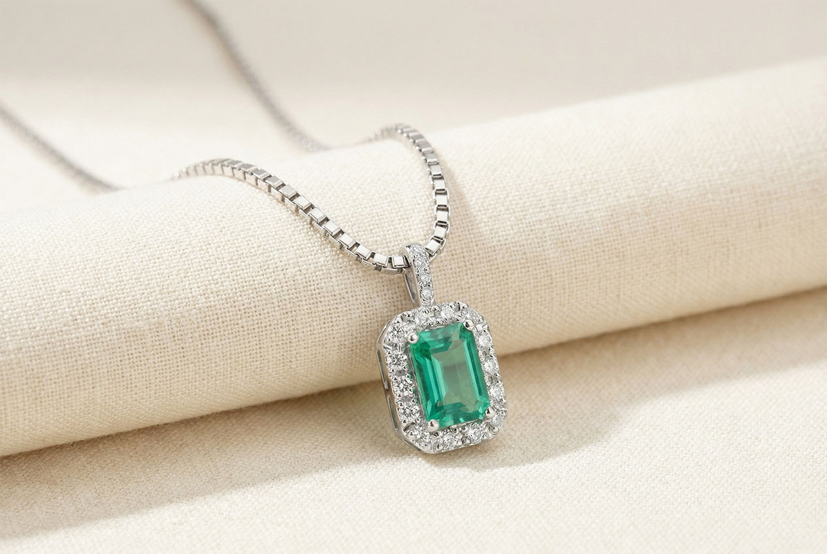 « L'ATELIER » N.º 207479Colgante Oro blanco 18 quilates - Esmeralda Rectángulo 0.3 quilates - Halo Diamante - Engastado Diamante - Cadenas Veneciana