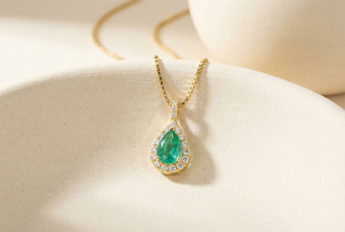« L'ATELIER » N.º 207862Colgante Oro amarillo 9 quilates - Esmeralda Pera 0.3 quilates - Halo Diamante - Engastado Diamante - Cadenas Veneciana