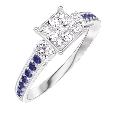 « L'ATELIER » Nº210335Anillo Oro blanco 18 quilates - Conjunto de diamantes naturales Princesa equivalente 0.7 - Piedras laterales Diamante - Engastado Zafiro azul
