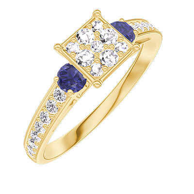 « L'ATELIER » N.º 210366Anillo Oro amarillo 9 quilates - Conjunto de diamantes naturales Princesa equivalente 0.7 - Piedras laterales Zafiro azul - Engastado Diamante