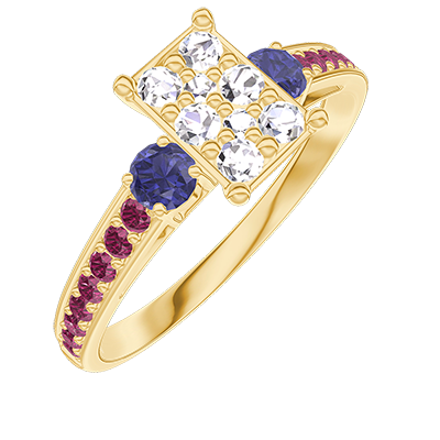 « L'ATELIER » N.º 210469Anillo Oro amarillo 18 quilates - Conjunto de diamantes naturales Rectángulo equivalente 0.7 - Piedras laterales Zafiro azul - Engastado Rubí
