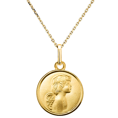 Esta medalla de oro amarillo presenta un ángel esculpido en relieve que encarna la pureza, la serenidad y la protección divina. El borde pulido resalta la elegancia atemporal de la pieza, siendo un regalo ideal para un bautizo o un nacimiento.
