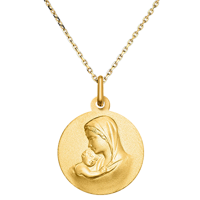 Esta medalla de oro amarillo captura un momento tierno y sagrado, mostrando a la Virgen María sosteniendo a su hijo Jesús. La dulzura de su mirada y la cercanía maternal crean una imagen poderosa de protección y amor infinito. Esta joya simboliza la pureza, la maternidad divina y la protección, perfecta para ocasiones espirituales como un bautismo o comunión.