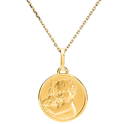 Representando al Niño Jesús sosteniendo un cordero, esta medalla encarna la dulzura, la fe y el símbolo del Buen Pastor, protector de la inocencia.