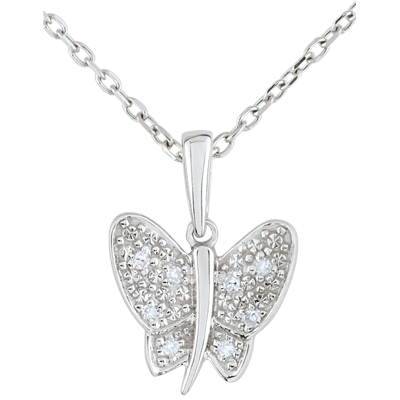 Una delicada mariposa de oro y diamantes cuyos destellos se mueven al unísono con los movimientos de la persona una vez suspendida en su cuello.
