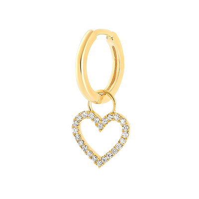 Una criolla adornada con su dije de oro amarillo en forma de corazón y empedrada con diamantes brillantes. Dimensiones del anillo del dije: 3,1 mm de diámetro.