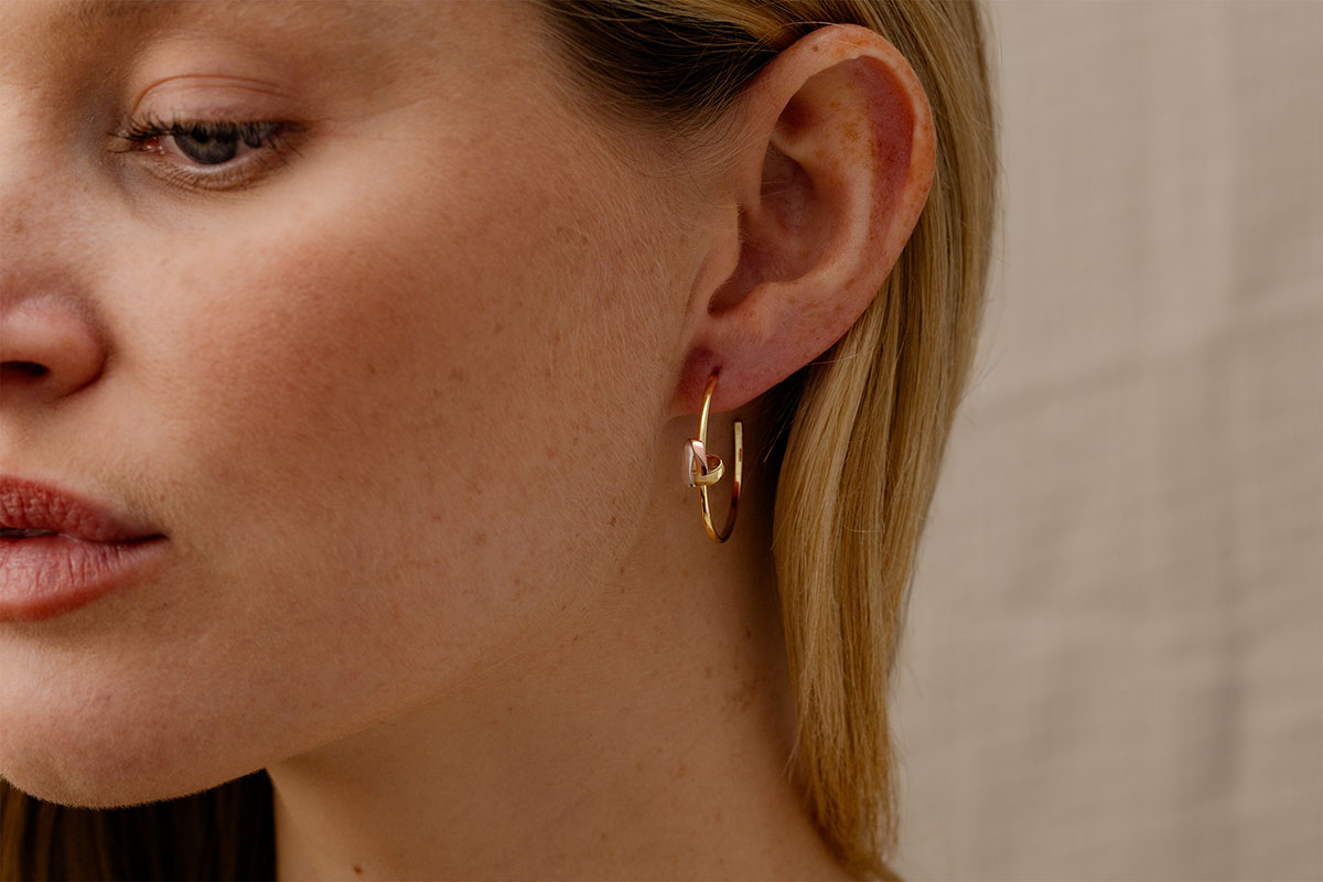 El corazón, ícono de la joyería, revisitada por Edenly en una versión origami donde los 3 oros se unen con originalidad y elegancia. Un modelo de la versión Pendientes criollos, finos y ligeros, que subrayan el rostro con originalidad.