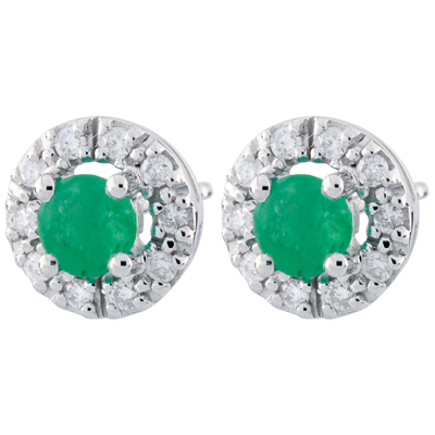 Un círculo de oro blanco engastado de diamante protege como si fuera un nido a la esmeralda.