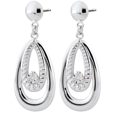 Dúo de pendientes con oro blanco labrado y un diamante central. Elegantes y distinguidos.