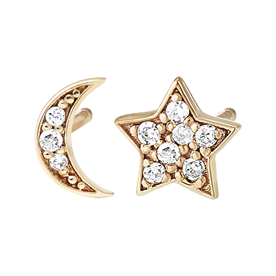 Un par de pendientes de oro amarillo en forma de estrella y luna adornados con 10 brillantes diamantes para un estilo moderno y elegante a la vez.