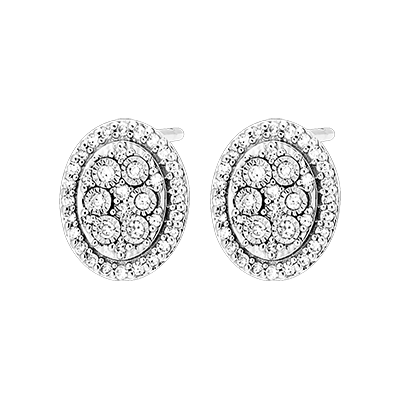 El brillo de los pendientes de pavé de diamante oval, coronados con un halo de diamante. Un par de sutiles y finos pendientes de oro blanco, con una elegancia atemporal.