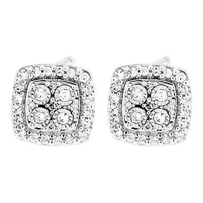 El resplandor de pendientes con pavé de diamantes cuadrados, coronados con un halo de diamante. Un par de tachuelas de oro blanco fino y sutil, impregnadas de una elegancia atemporal.