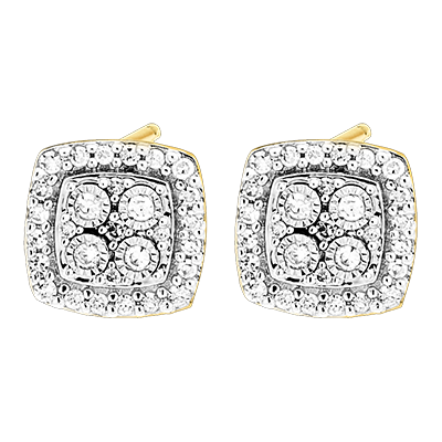 El resplandor de pendientes con pavé de diamantes cuadrado, coronados con un halo de diamantes. Un par de tachuelas de oro blanco y amarillo fino y sutil, con una elegancia atemporal.