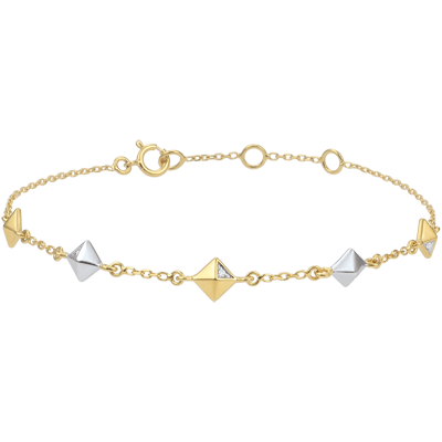 Estas preciosas pirámides están inspiradas en la forma de los diamantes en bruto, en una de sus facetas podemos hallar algunos diamantes. Se trata de una creación elegante y moderna. Montados sobre una cadena en oro amarillo, cinco motivos en oro blanco y amarillo se suceden. Pulsera Génesis - de longitud ajustable:18 cmm,17 cm, 16cm. Motivo de 5,5 mm longitud y 5,5 mm de altura.
