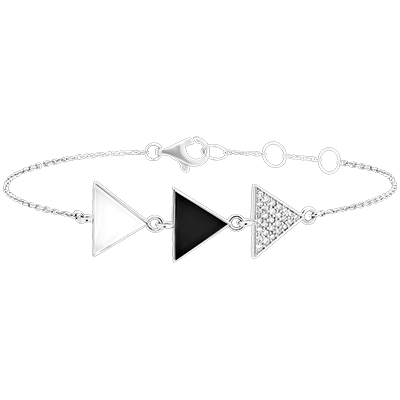 Una pulsera delicada de oro blanco, adornada con tres triángulos entrelazados - uno engastado con diamantes, los otros en esmalte negro y blanco contrastante. Un juego de formas y luces para una elegancia moderna.