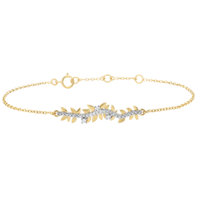 Hojas de oro amarillo con diamantes se alternan con hojas de oro rugoso, frotado a mano, para crear una pulsera romántica salpicada con 7 diamantes cuales gotas de rocío que realzan el brillo natural de esta preciosa pieza única. Pulsera de longitud ajustable: 18 cm, 17 cm, 16 cm. Motivo de 30 mm de largo y 5 mm de alto.
