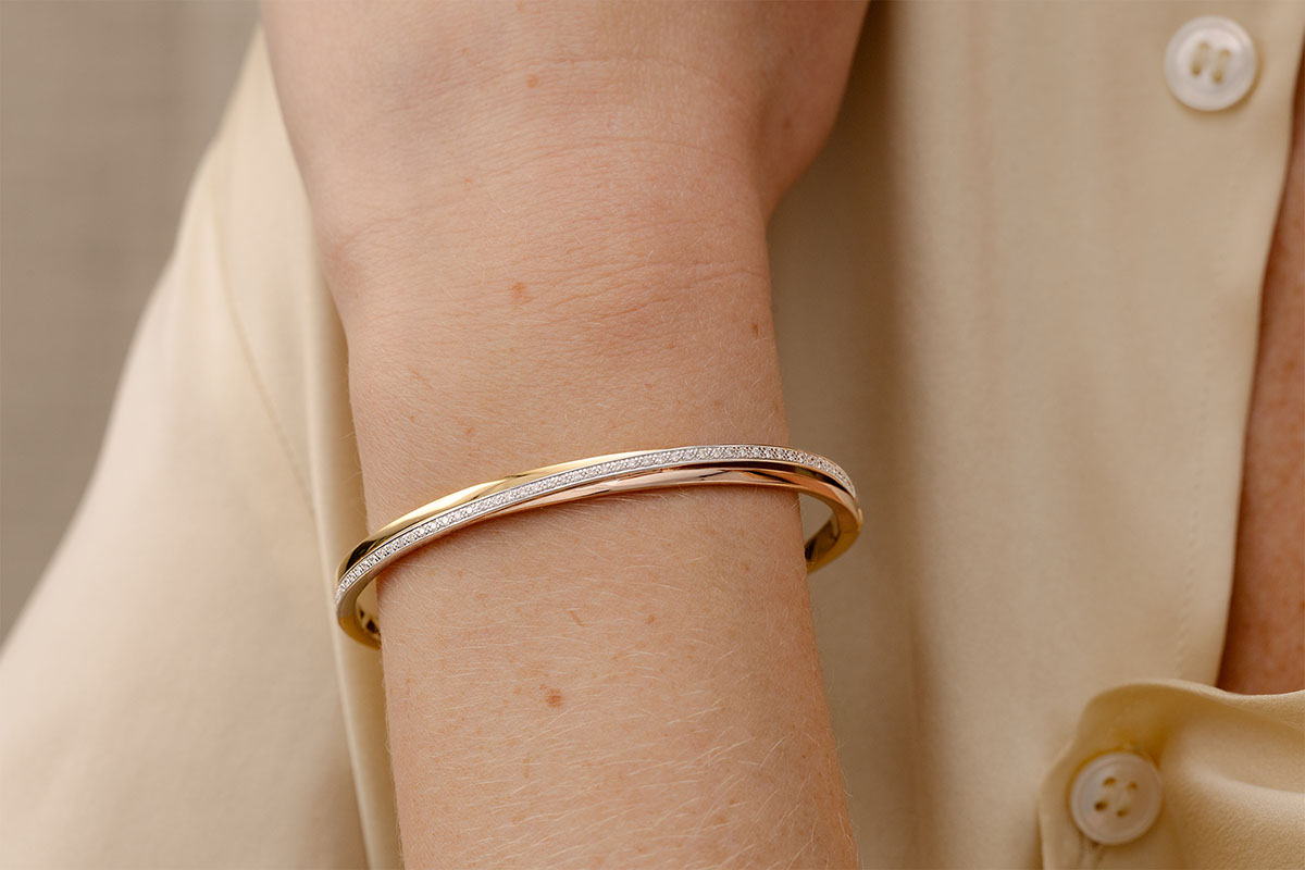 Una unión en equilibrio de tres tipos de oro sublimada con un empedrado de diamantes sobre oro blanco obtiene como resultado esta preciosa y sofisticada pulsera.