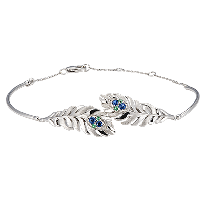 El brazalete Signature en oro blanco de 18 quilates luce un elegante motivo de pluma, adornado con 8 esmeraldas y zafiros sintéticos. Finamente elaborado, su diseño engastado se cierra con un cierre discreto. Una pieza refinada que captura la esencia aérea y el refinamiento inigualable de las plumas, la firma de la colección Panache.