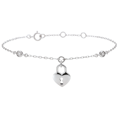 Un corazón de oro blanco, portador de una cerradura en su centro, está montado sobre una cadenita de oro blanco adornada con dos diamantes brillantes. Pulsera de longitud ajustable: 18 cm, 17 cm, 16 cm. Motivo de 8 mm de largo y 11 mm de alto.
