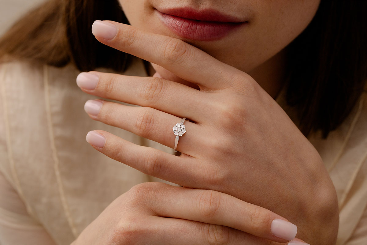 Flores y diamantes. delicadeza y elegancia.Un fino solitario con flor de diamantes sobre Oro Blanco.