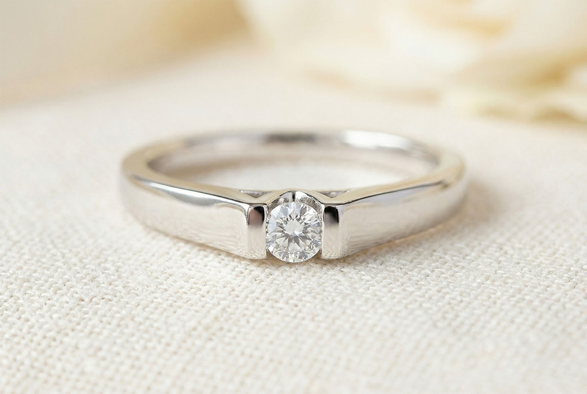La brillantez absoluta de un diamante situado en el medio sobre una montura gráfica y contemporánea.
