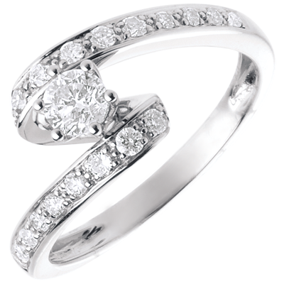 Un diamante solitario arropado por una ola de oro blanco, la inclinación de la misma la convierten en una pieza de gran feminidad.