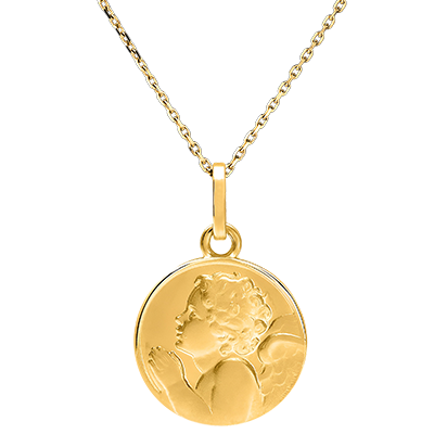 Con un ángel orante, símbolo de pureza y protección, esta medalla encarna la fe y la serenidad.