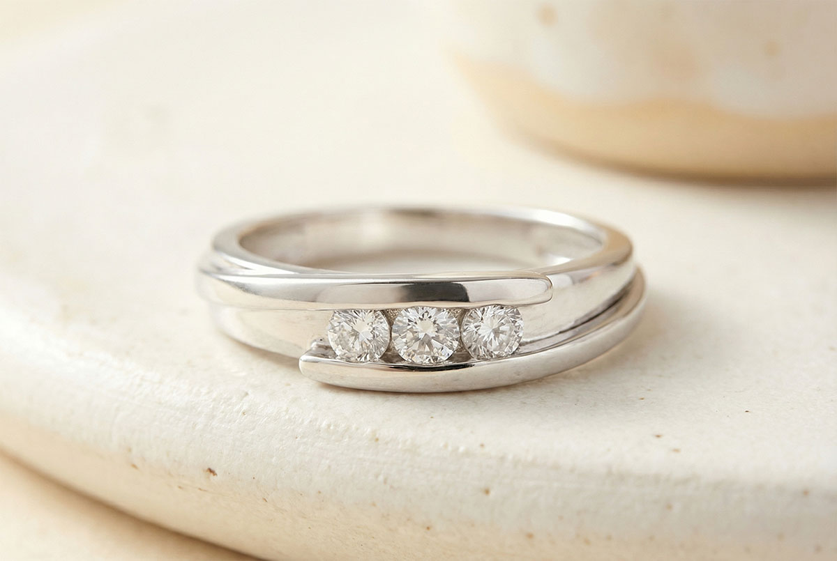 Una montura elegante y clásica que destaca por los tres diamantes que coronan la pieza.