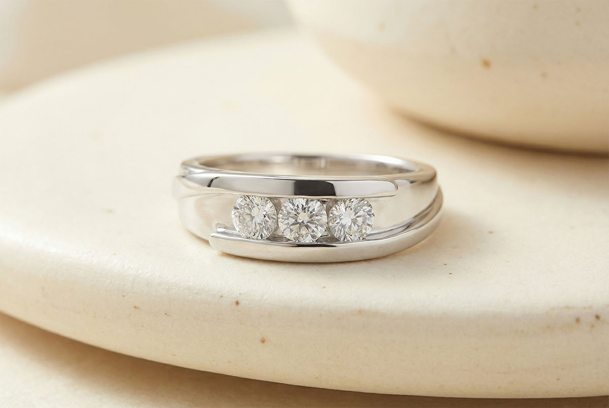 Una montura sobria y clásica realzada por un delicado junco que se abre a una trilogía de diamantes.