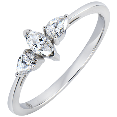 La delicadeza de una trilogía de diamantes, que unen con elegancia un diamante marquesa con dos diamantes pera.
