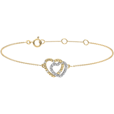 Esta pieza exquisita, adornada con dos corazones entrelazados de oro amarillo y blanco finamente trabajado, simboliza la ternura y la complicidad.