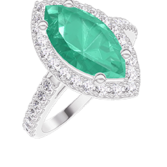 Anillo Oro blanco 9 quilates - Esmeralda Marquesa 1 quilates - Halo Diamante - Engastado Diamante
