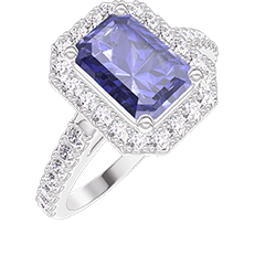 Anillo Oro blanco 18 quilates - Zafiro sintético Rectángulo 1 quilates - Halo Diamante de laboratorio - Engastado Diamante de laboratorio