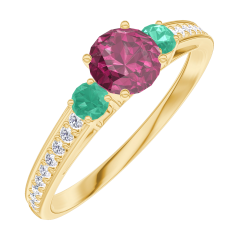 Anillo Oro amarillo 9 quilates - Rubí redondo 0.3 quilates - Piedras laterales Esmeralda - Engastado Diamante