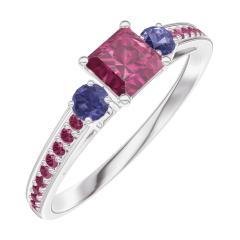 Anillo Oro blanco 18 quilates - Rubí Princesa 0.3 quilates - Piedras laterales Zafiro azul - Engastado Rubí
