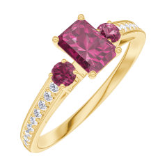 Anillo Oro amarillo 18 quilates - Rubí Rectángulo 0.3 quilates - Piedras laterales Rubí - Engastado Diamante