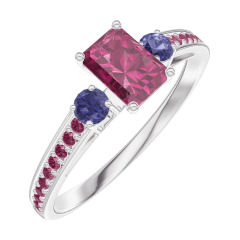 Anillo Oro blanco 9 quilates - Rubí Rectángulo 0.3 quilates - Piedras laterales Zafiro azul - Engastado Rubí