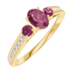 Anillo Oro amarillo 18 quilates - Rubí Ovalo 0.3 quilates - Piedras laterales Rubí - Engastado Diamante