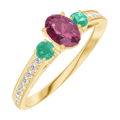 « L'ATELIER » N.º 160985Anillo Oro amarillo 18 quilates - Rubí Ovalo 0.3 quilates - Piedras laterales Esmeralda - Engastado Diamante 5