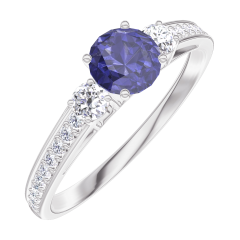 Anillo Oro blanco 18 quilates - Zafiro azul redondo 0.3 quilates - Piedras laterales Diamante - Engastado Diamante