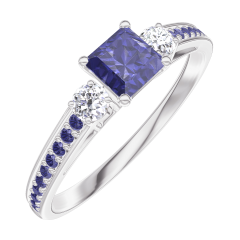 Anillo Oro blanco 18 quilates - Zafiro azul Princesa 0.3 quilates - Piedras laterales Diamante - Engastado Zafiro azul