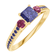 Anillo Oro amarillo 9 quilates - Zafiro azul Princesa 0.3 quilates - Piedras laterales Rubí - Engastado Zafiro azul
