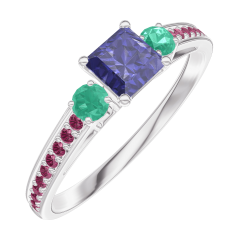 Anillo Oro blanco 18 quilates - Zafiro azul Princesa 0.3 quilates - Piedras laterales Esmeralda - Engastado Rubí