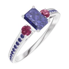 Anillo Oro blanco 9 quilates - Zafiro azul Rectángulo 0.3 quilates - Piedras laterales Rubí - Engastado Zafiro azul