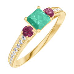 Anillo Oro amarillo 18 quilates - Esmeralda Princesa 0.3 quilates - Piedras laterales Rubí - Engastado Diamante