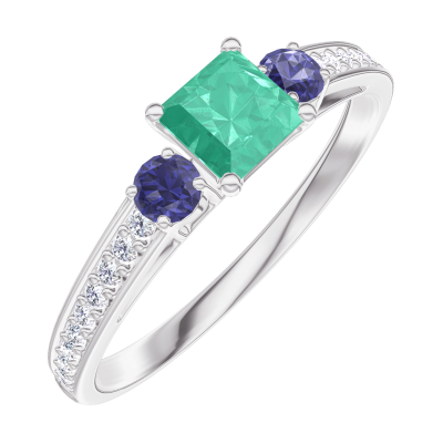 « L'ATELIER » Nº161967Anillo Oro blanco 18 quilates - Esmeralda Princesa 0.3 quilates - Piedras laterales Zafiro azul - Engastado Diamante
